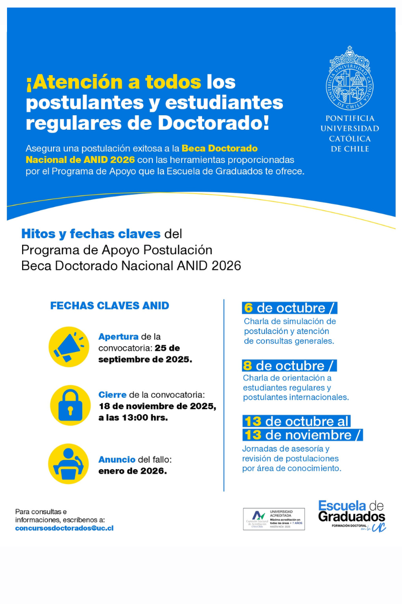 En el contexto del proceso de postulación a la Beca de Doctorado Nacional ANID correspondiente al año académico 2026, la Escuela de Graduados invita a los y las estudiantes regulares, así como a postulantes a los programas de doctorado de la UC, a participar en el Programa de Apoyo a la Postulación a la Beca de Doctorado Nacional ANID 2026. Este programa tiene como objetivo brindar orientación y acompañamiento durante el proceso de postulación, con el propósito de maximizar las posibilidades de éxito en la obtención de esta beca para estudios doctorales.