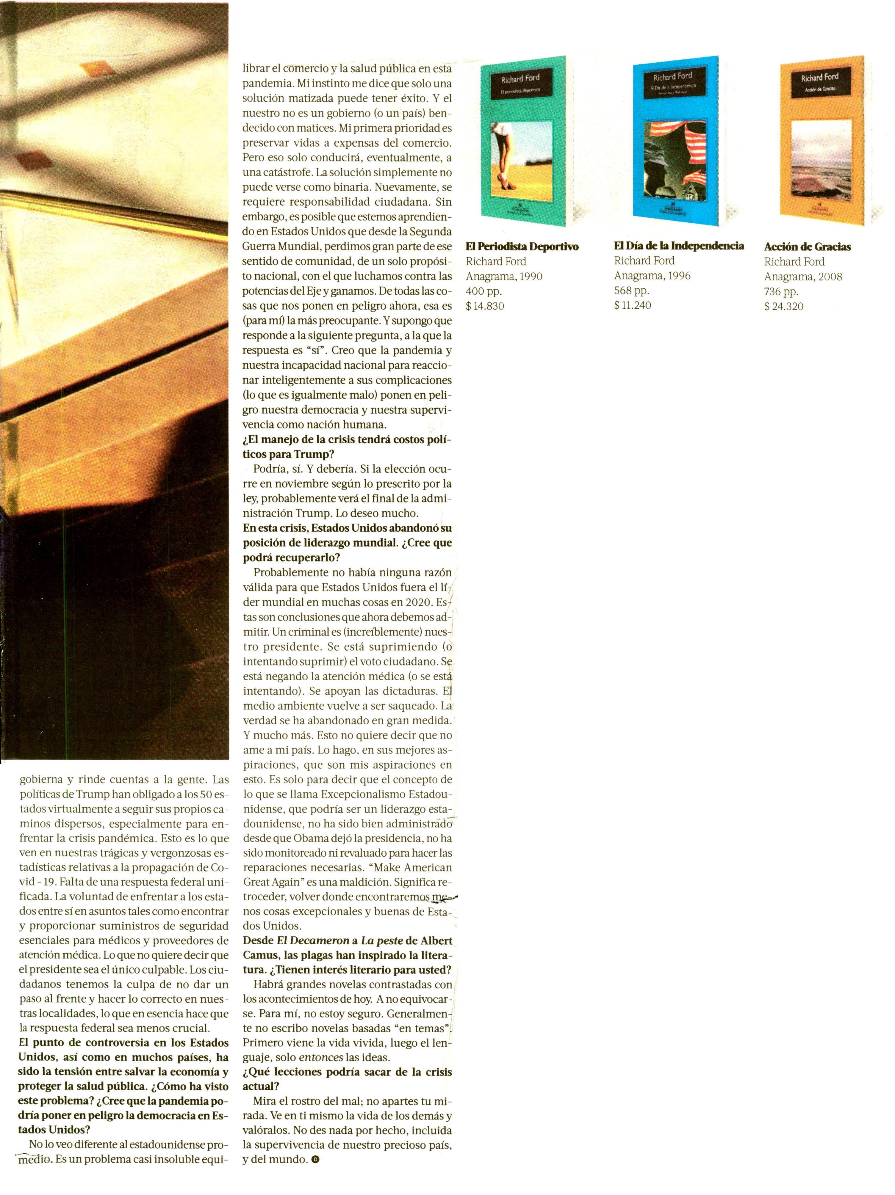 La Tercera entrevista al novelista estadounidense Richard Ford sobre los bordes políticos de la crisis sanitaria y la pérdida de liderazgo de EE.UU. Se menciona su visita al país en 2009, invitado al ciclo La Ciudad y las Palabras de la UC.