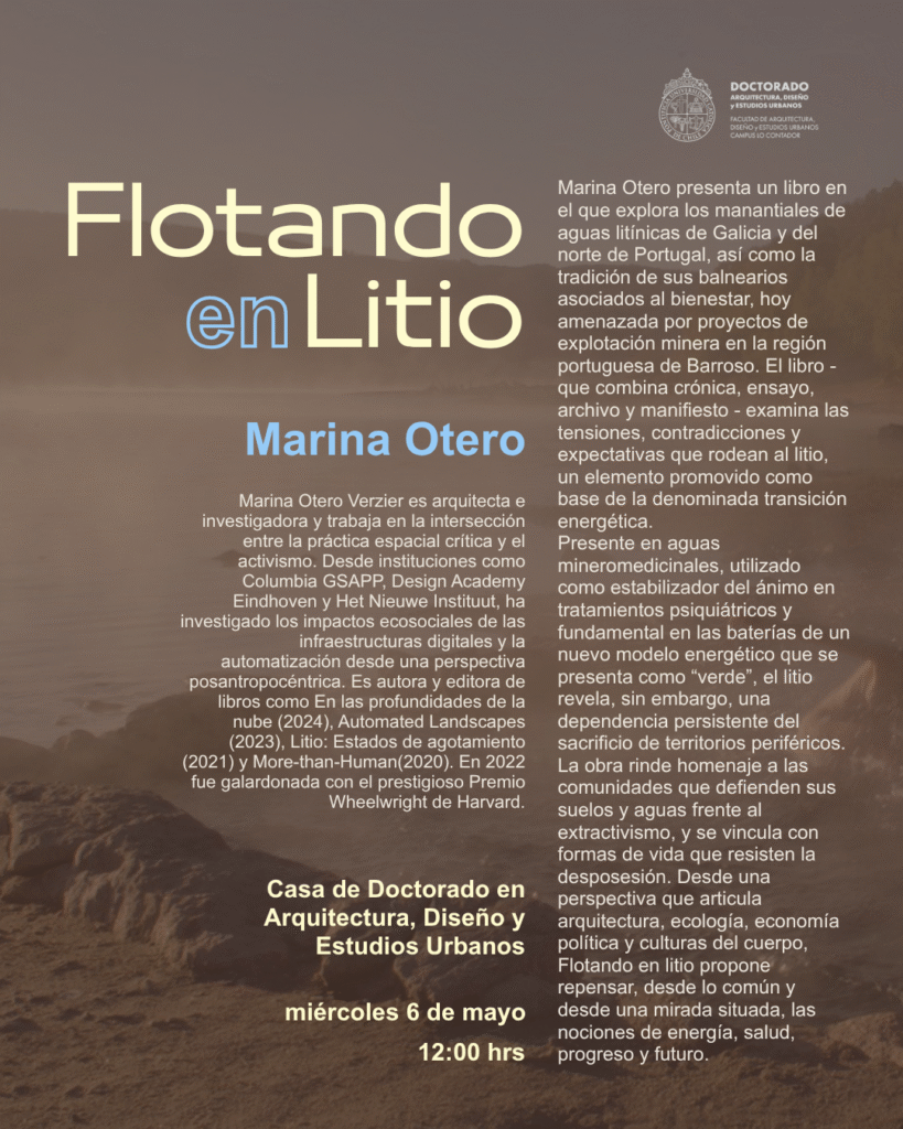 En Flotando en litio, Marina Otero Verzier se sumerge en los manantiales de aguas litínicas de Galicia y el norte de Portugal y sus históricos balnearios del bienestar, una cultura en peligro por los proyectos de explotaciones mineras en la región lusa de Barroso. En este seminario, Otero presentará su último libro —a la vez crónica, ensayo, archivo y manifiesto— donde rastrea las tensiones, contradicciones y promesas que orbitan en torno al litio, un elemento químico jaleado como pilar de la llamada transición energética. Presente en aguas mineromedicinales, estabilizador del ánimo en tratamientos psiquiátricos, alimenta las baterías en un nuevo modelo energético que se autoproclama verde pero que se asienta (de nuevo) en el sacrificio de territorios periféricos. El libro rinde homenaje a quienes defienden los suelos y las aguas frente al extractivismo, y se alía con formas de vida que se resisten a la desposesión. Con una mirada que entrelaza arquitectura, ecología, economía política y culturas del cuerpo, Flotando en litio es una invitación a repensar desde lo común —y desde dentro— qué entendemos por energía, salud, progreso y futuro.