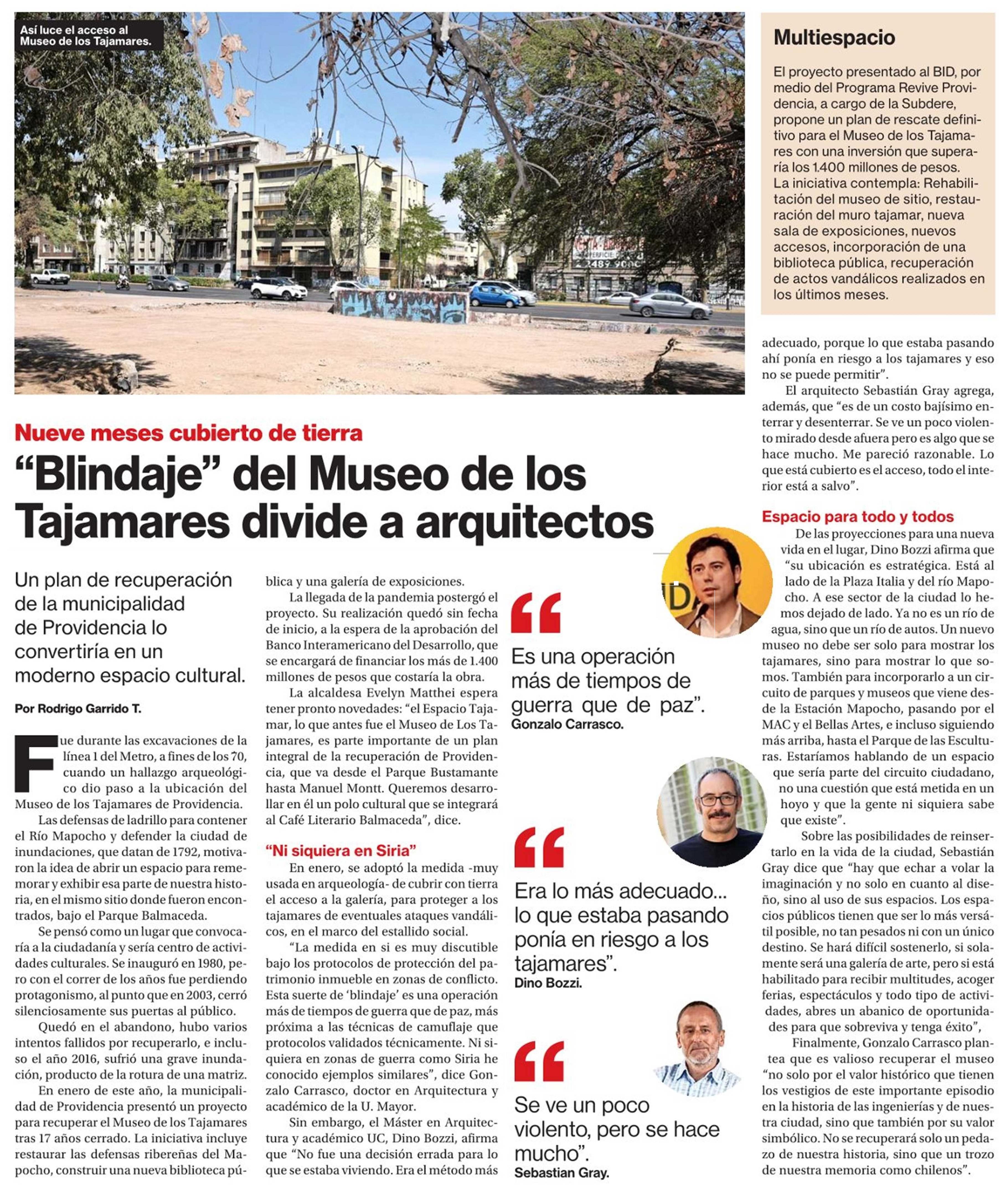 La Segunda destaca el plan de recuperación de la municipalidad de Providencia para recuperar el Museo de los Tajamares tras 17 años cerrado. Comentan el doctor en Arquitectura y Estudios Urbanos, Gonzalo Carrasco y los académicos de la Escuela de Arquitectura, Dino Bozzi y Sebastián Grey.